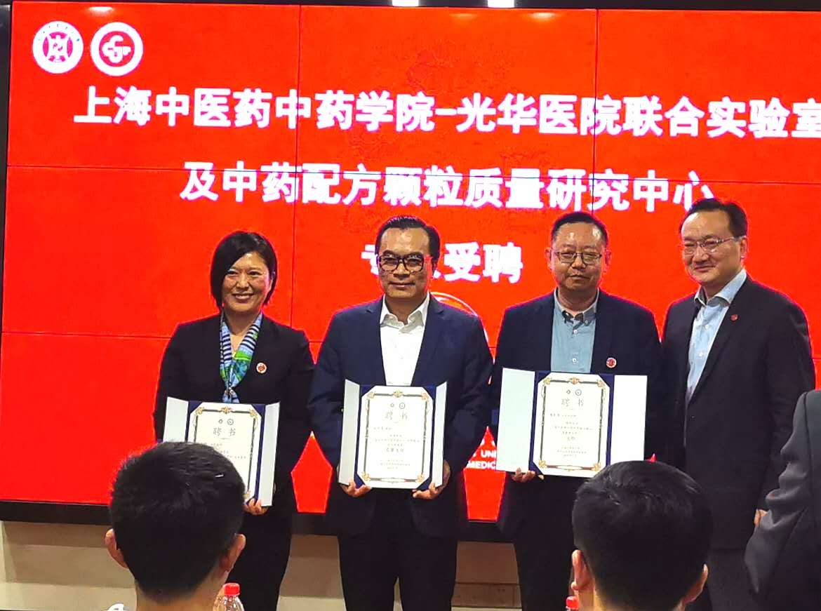 首先,光华医院肖涟波经理向大家介绍了光华医院近年来的成绩和进步。肖涟波经理感谢了伟德对光华医院医-教-研全方面发展过程中的帮助,并期待双方通过联合实验室展开更多有关制剂研发转化的合作。随后伟德徐宏喜经理介绍了伟德近年来与光华医院达成的合作成果,并介绍了伟德-光华医院联合实验室的发展基础和方向。伟德将与光华医院一起为推动中药现代化、标准化而努力。接下来,徐建光董事长、王为人书记、胡鸿毅副局长、陆浩副区长共同为伟德-光华医院联合实验室、中药配方颗粒质量研究中心揭牌。徐建光董事长为联合实验室名誉主任徐宏喜教授、主任冯辉主任医师、伟德中药配方颗粒质量研究中心主任徐宏喜教授和谢东浩主任中药师颁发了聘书。最后,上海市名中医朱生樑教授向各位领导介绍了自己从医多年对膏方疗效和应用的心得体会。