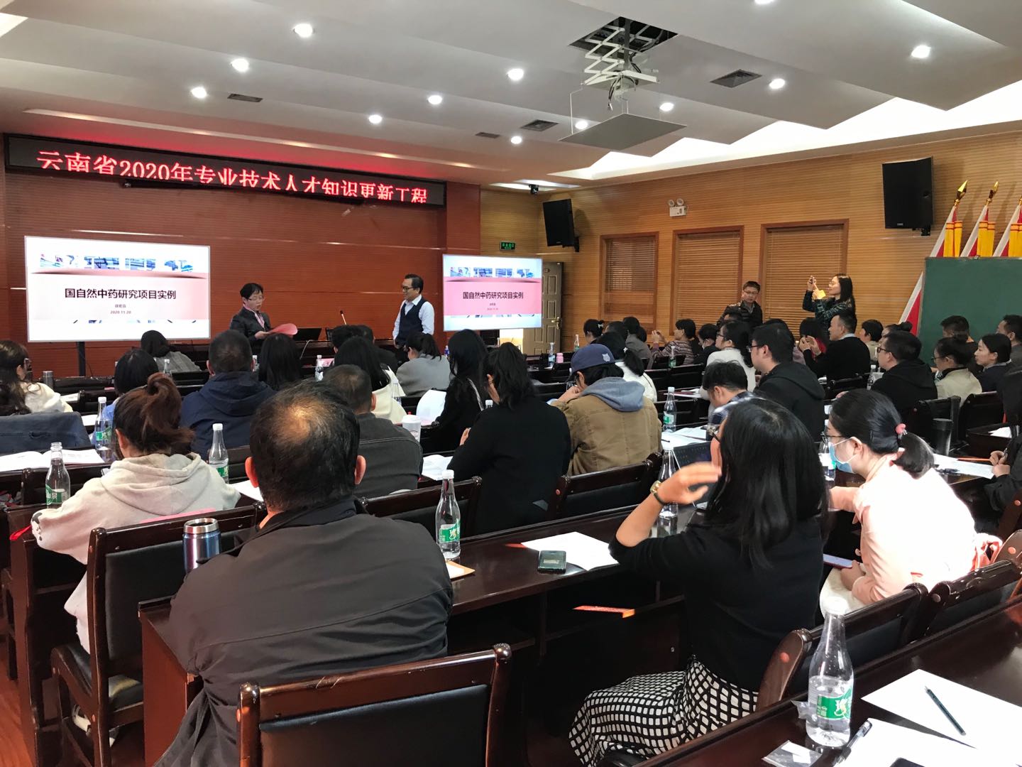 2020年11月20日云南省 2020 年专业技术人才知识更新工程“疫情防控常态下中医药人才培养”高级研修班培训在云南中医药大学召开,公司徐宏喜经理受邀参加并向大家讲解国自然項目申报实例分析。参会人员积极提问,会议气氛热烈。
