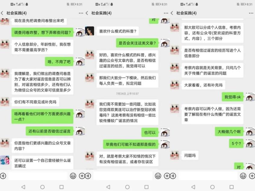 2020年7月6日,社会实践伟德-微信公众号+“谣言体”中医药科普模式的探索和实践服务团队正式开始暑期线上社会实践的讨论。通过微信语音通话,小组负责人与成员沟通交流后,决定使用微信公众号推送文章的方式来进行中医药知识的辟谣和科普。接着,组员们在线进行了前期调查问卷的任务分工。成员分为三组,一组负责问卷中个人信息填写部分;’一组通过查阅文献资料、咨询老师等途径,编写问卷中关于中医药谣言的部分;最后一组则编写关于公众号文章科普的形式、内容等相关调查问题。