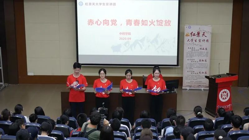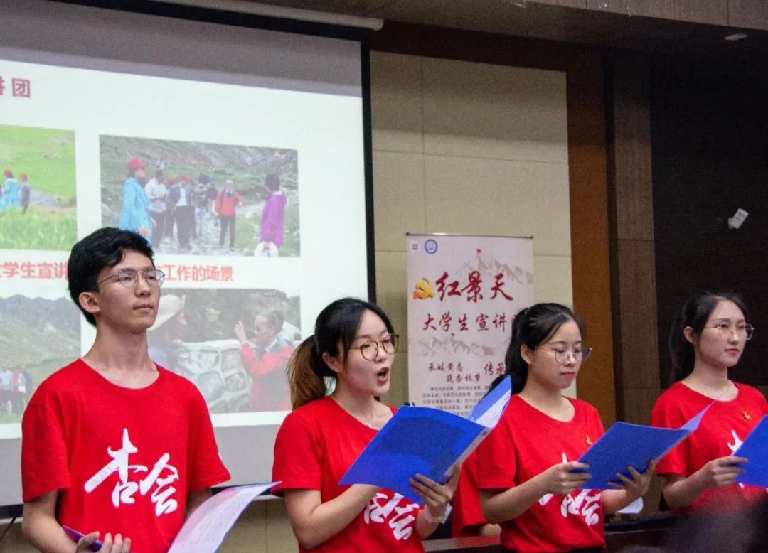 红色的底衫上印着“杏会”二字的红景天学长们的声情并茂的朗读,让我明白了咱中医青年的责任与担当。他们用实际行动告诉了我们上中医的学子应勇立潮头,为国家的发展添砖加瓦,为民族的复兴铺路架桥!那红色T恤似乎就象征着那屹立在高原的红景天,他们所讲的去西藏的奉献人物又何尝不是那“红景天”最好的代言。这激励着我们新一代青年学习、借鉴、进步,就像那高原的使者给我们的第一抹亮色!