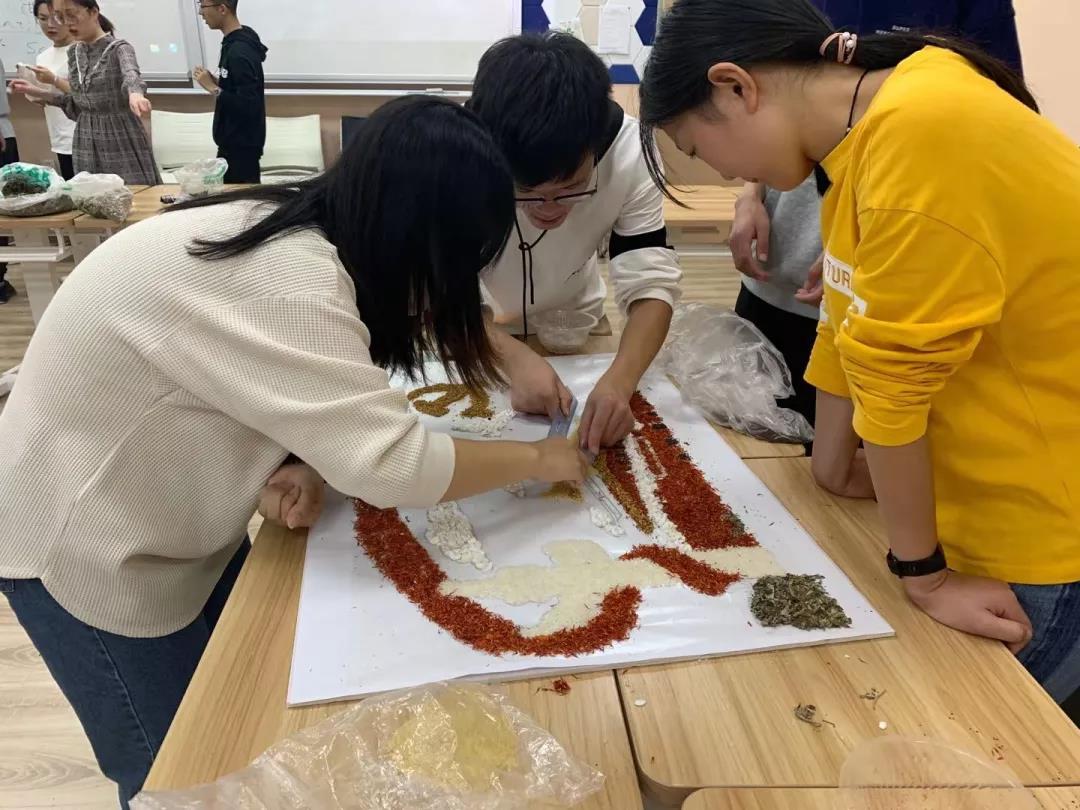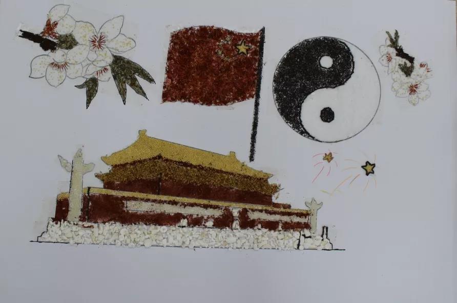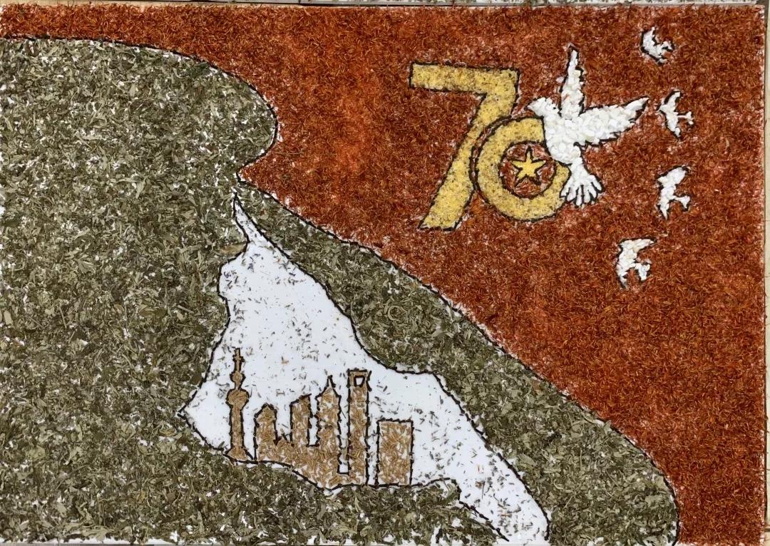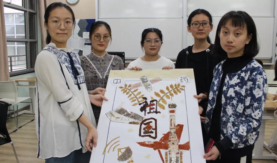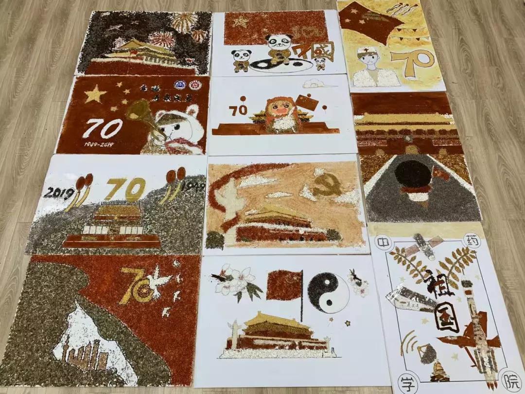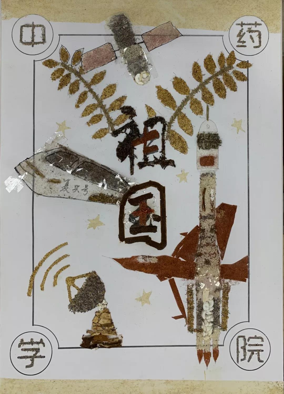 参加比赛的同学们兴趣盎然,全身心投入到中药贴画的氛围中,小心翼翼,却又兴奋难耐。时间流逝,画板渐渐被散发特殊香味的中药填满,化作了国旗、天安门、和平鸽……经过手忙脚乱、状况百出的两个小时后,在所有人的耐心、坚持下,11份以“庆祖国70周年”为主题的作品由红花,丁香、冰片、薰衣草、艾叶、茯苓等材料组成,借此来祝祖国母亲生日快乐。