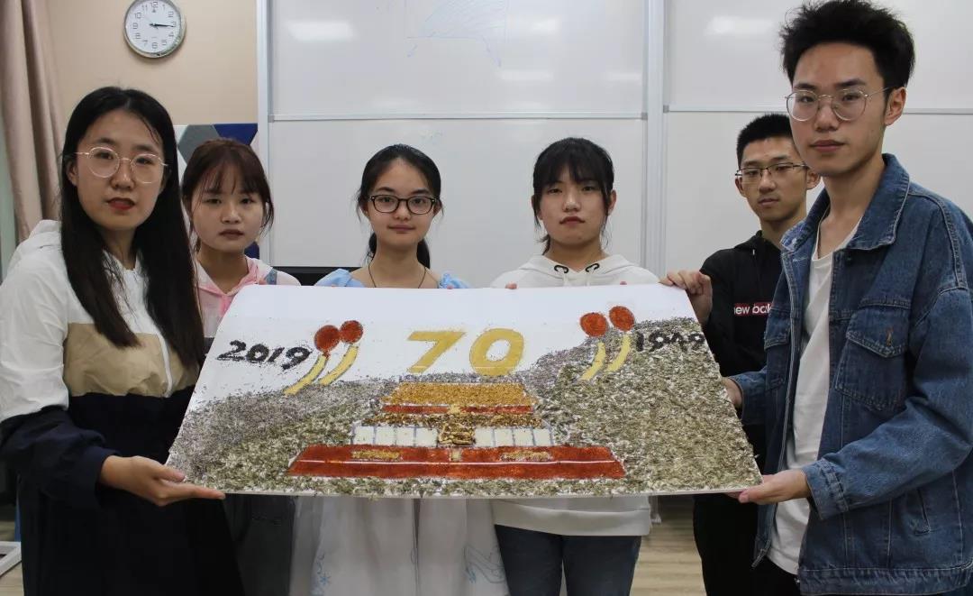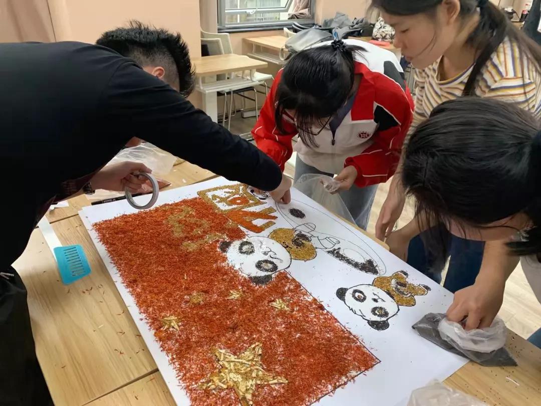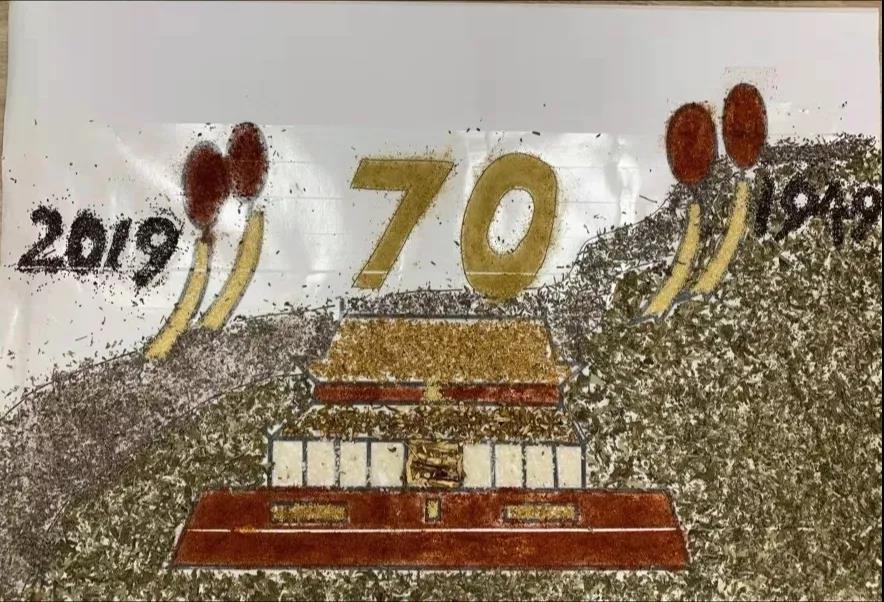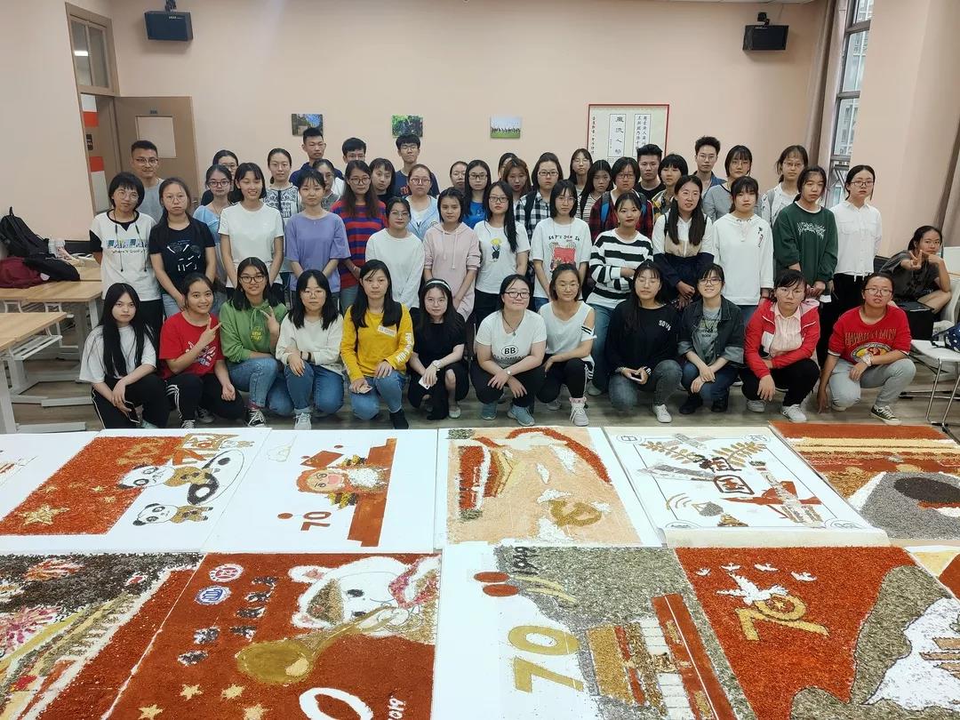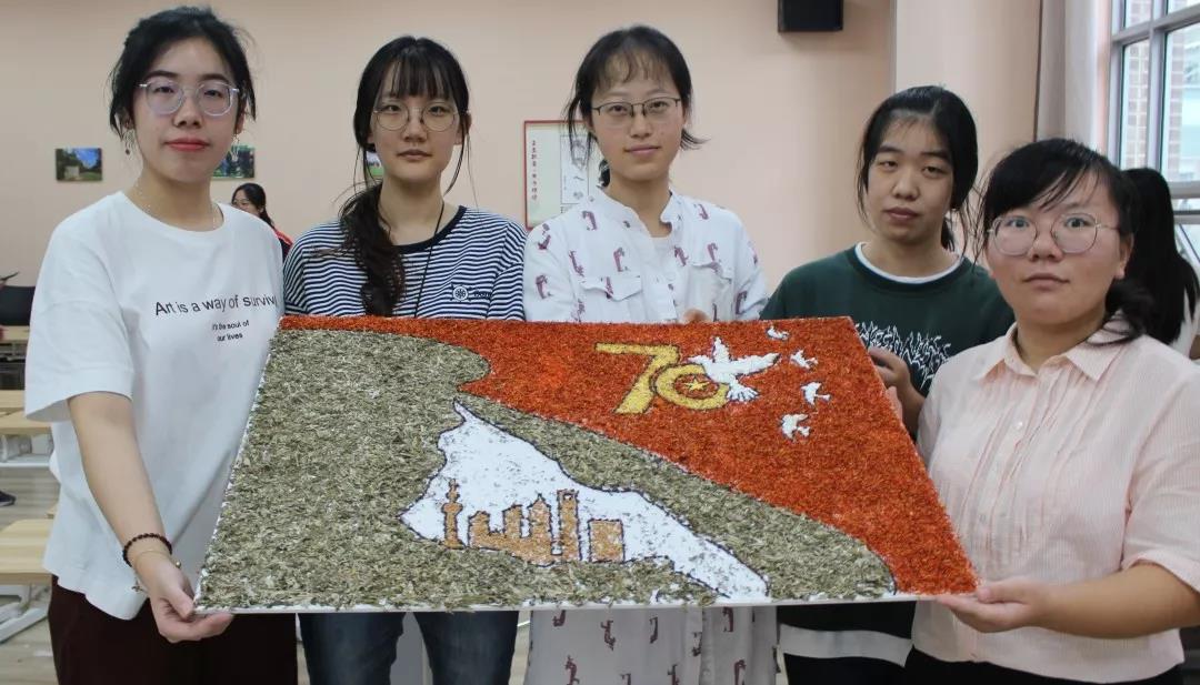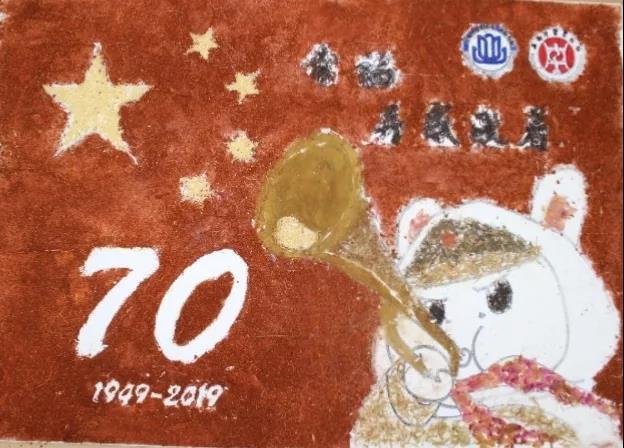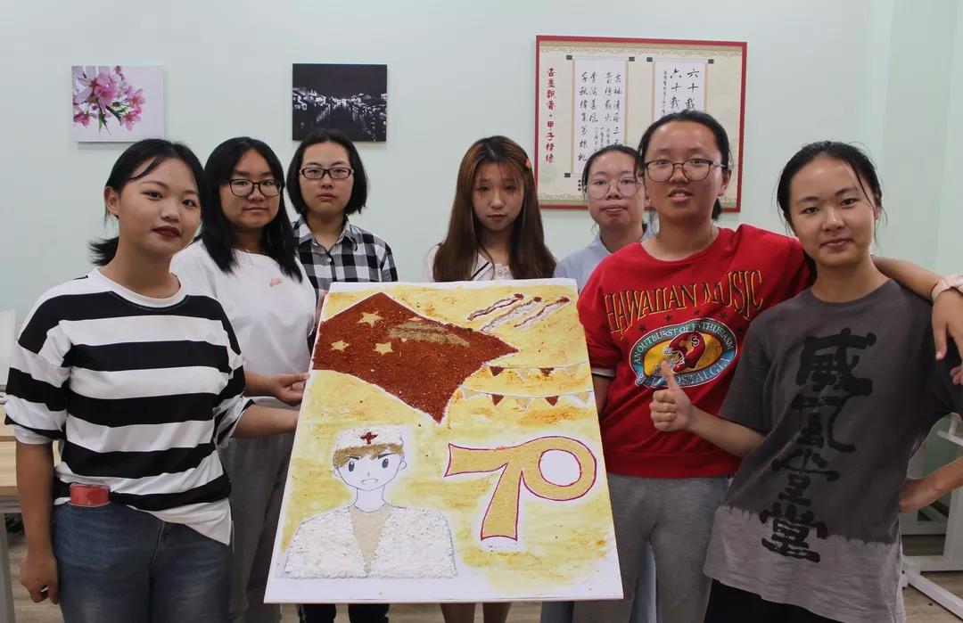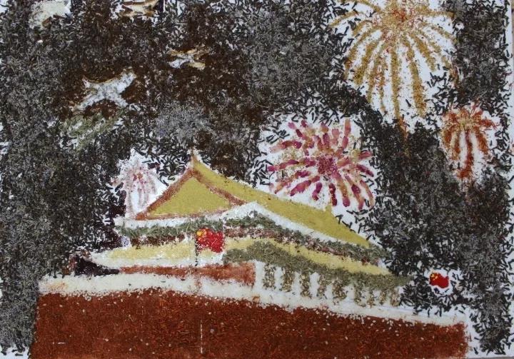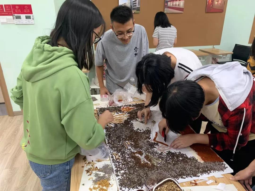 参加比赛的同学们兴趣盎然,全身心投入到中药贴画的氛围中,小心翼翼,却又兴奋难耐。时间流逝,画板渐渐被散发特殊香味的中药填满,化作了国旗、天安门、和平鸽……经过手忙脚乱、状况百出的两个小时后,在所有人的耐心、坚持下,11份以“庆祖国70周年”为主题的作品由红花,丁香、冰片、薰衣草、艾叶、茯苓等材料组成,借此来祝祖国母亲生日快乐。