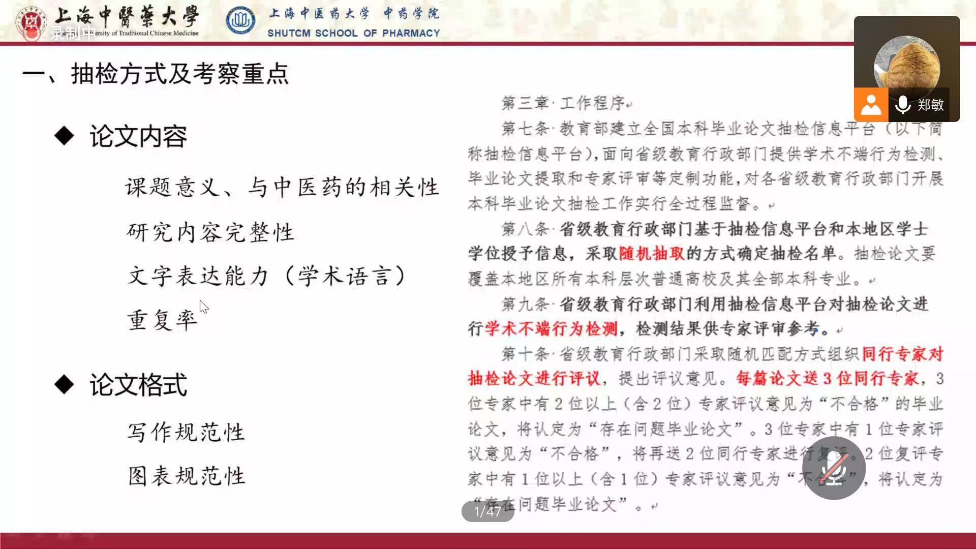 为贯彻落实教育部关于《本科毕业论文(设计)抽检办法》的精神,保证本科人才培养质量,严把出口关,伟德于2021年4月9日晚上通过腾讯会议在线上召开了2021届中药学专业本科生学术规范宣讲会。