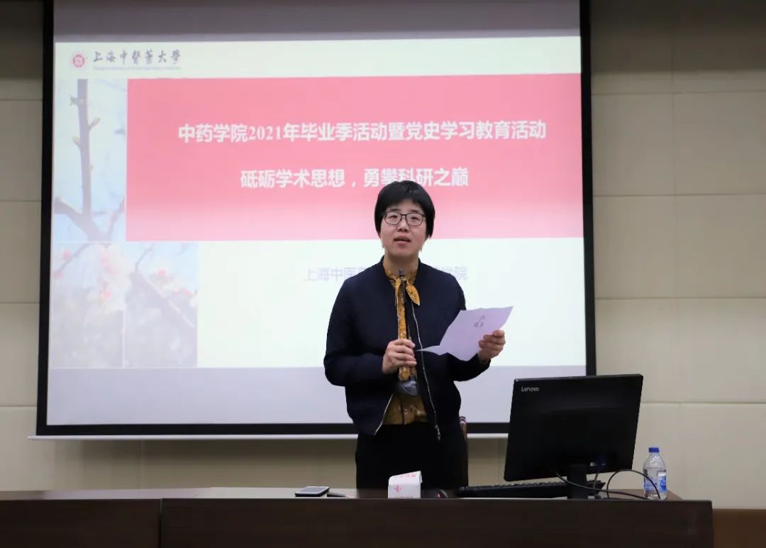 56日,伟德在教学楼6501教室举行伟德2021毕业季主题教育活动暨党史学习教育第三场讲座《砥砺学术思想,勇攀科研之巅》,会议由中药公司党委副书记沈漫主持。会前沈书记介绍了本次的主讲人黄容琴教授,黄容琴教授系复旦大学药学院教授,博士生导师,国家优秀青年科学基金获得者。沈书记就黄教授的科研履历、课题研究、学术兼职等向同学们做了详细的介绍,希望广大毕业生在今后的的科研求学中积极进取、锐意创新,不断创新中药研究,用更高质量的科研成果推动中医药的现代化研究。