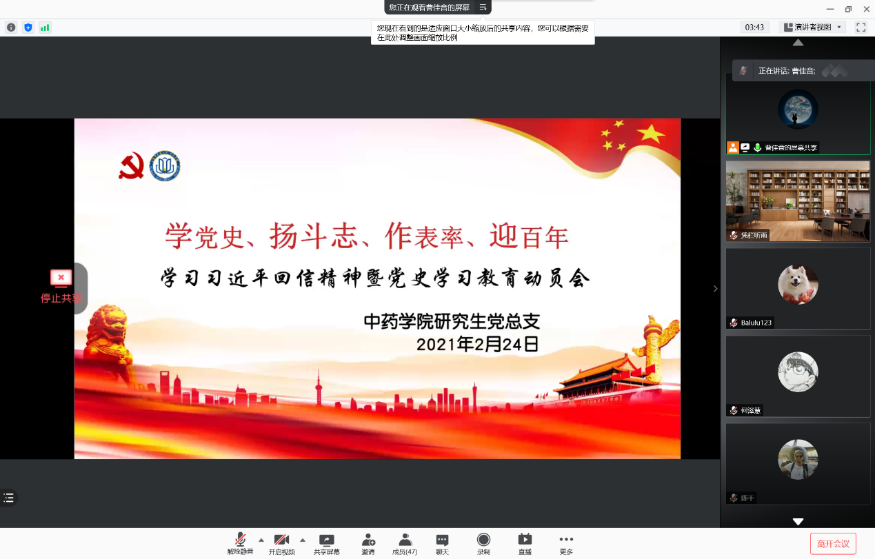 2021年2月20日,党史学习教育动员大会在北京召开,习近平总书记强调,在全党开展党史学习教育,全党同志要做到学史明理、学史增信、学史崇德、学史力行,学党史、悟思想、办实事、开新局。为庆祝中国共产党百年华诞,号召中药学子牢记初心使命,倡议全体青年在新时代接续奋斗,以党史学习教育动员大会为遵循,2月24日,伟德研究生党总支举行党史学习教育动员大会,中药公司党委书记李医明老师,党委副书记沈漫老师,研究生党总支书记陈秀兰老师出席,会议由总支组织委员曹佳音主持,研究生党总支全体党员参会。