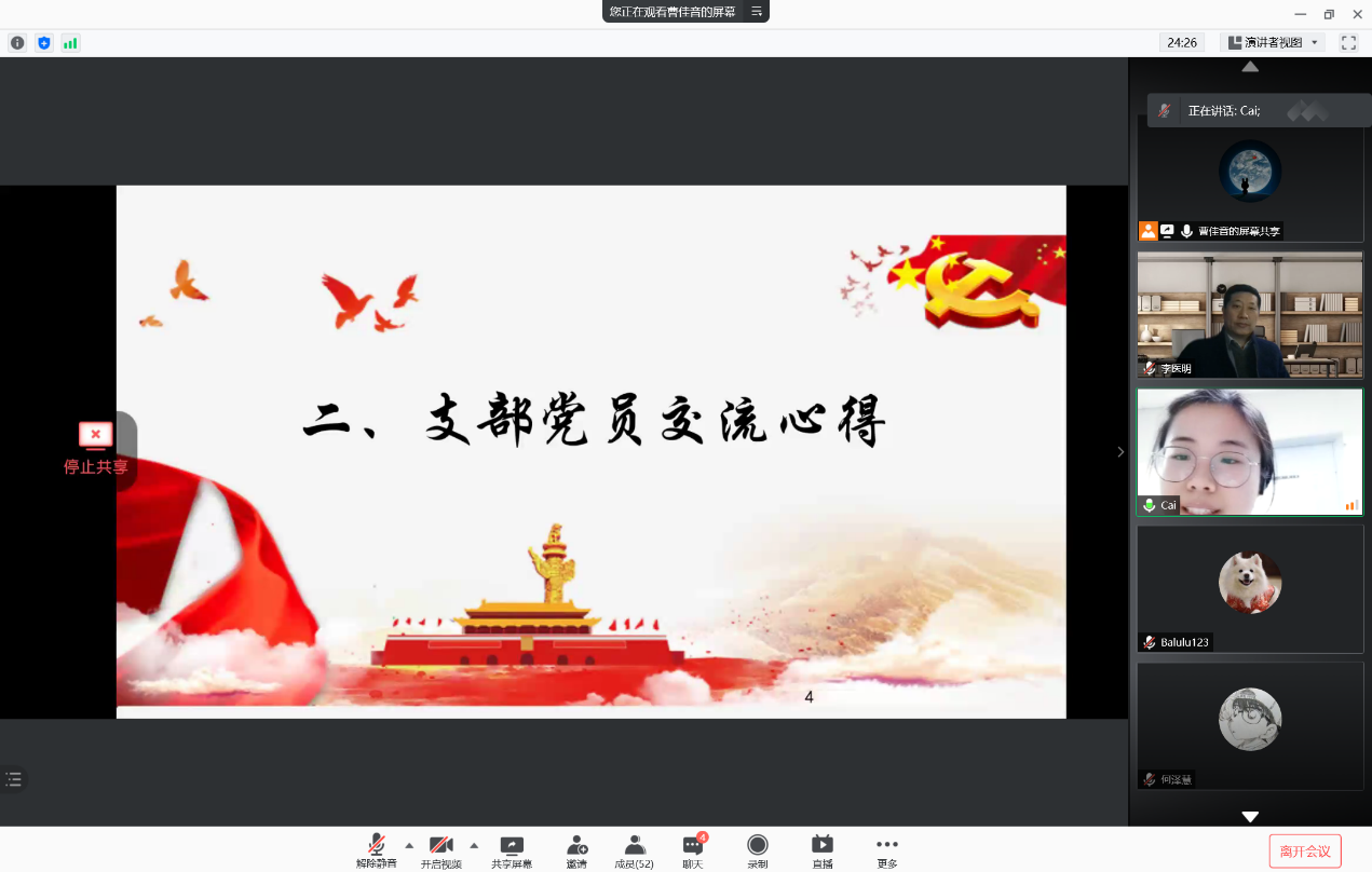扬斗志激发党员延续精神血脉。在一百年的非凡奋斗历程中,一代又一代的中国共产党人顽强拼搏、不懈奋斗,构筑起了中国共产党人的精神谱系。传承红色基因,赓续共产党人的精神血脉、始终保持革命者大无畏的奋斗精神,是每一个共产党人神圣的使命与责任。党史学习教育动员是一次固本培元、精神滋养的学习动员会,支部党员心中深有感触,纷纷表达内心感悟与所得,支部内与支部间进行心得交流。阮航同志认为,作为员工党员,我们更应该学习党史,铭记历史,以先辈们的优良品德与高尚情操不断鞭策自身。何泽慧同志真发言,作为百强样板党支部的一员感到无比光荣,因此更要主动学习党史,不断提升学习能力,增强自身使命感,为党支部发展添砖加瓦。来自江西兴国的何远志同志更是谈到了家乡革命老区的英雄先辈们的可歌可泣的事迹,并以此为激励,更加努力学习,用所学专业知识报效国家。