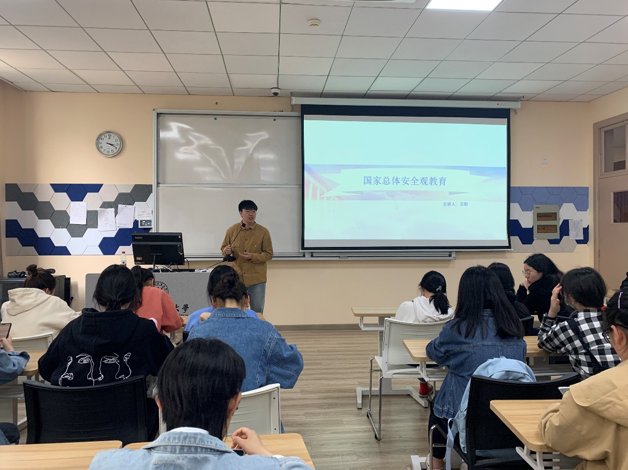 本次主题班会内容分为三个部分,王盼首先从“国家总体安全观”概念切入,介绍国家总体安全观的新特征新变化,解释了国家总体安全观在“谁的安全”、“什么威胁安全”、“谁保障安全”“怎样保障安全”等四类问题上的变化。并提醒同学们需要从环境-客体-主体三个维度,辩证看待、分析国家安全问题。而后,王盼与全体同学一起回顾了新中国成立以来,党史中国家安全观的变化历程,分别为新中国成立到改革开放前,以战争与革命为主题,以生存安全为目标的传统国家安全观;从改革开放后至中共十八大之间,以和平与发展为主题,以发展安全为目标的转型国家安全观;以及自十八大以来以安全与发展为主题,以综合安全为目标的总体国家安全观。并总结到,中国共产党始终领导全国人民,敢为人先,开创出新的局面。最后,王盼叮嘱班级内全体同学,在第三学期即将开始的见习教学中,需注意个人安全,保质保量完成见习学习。