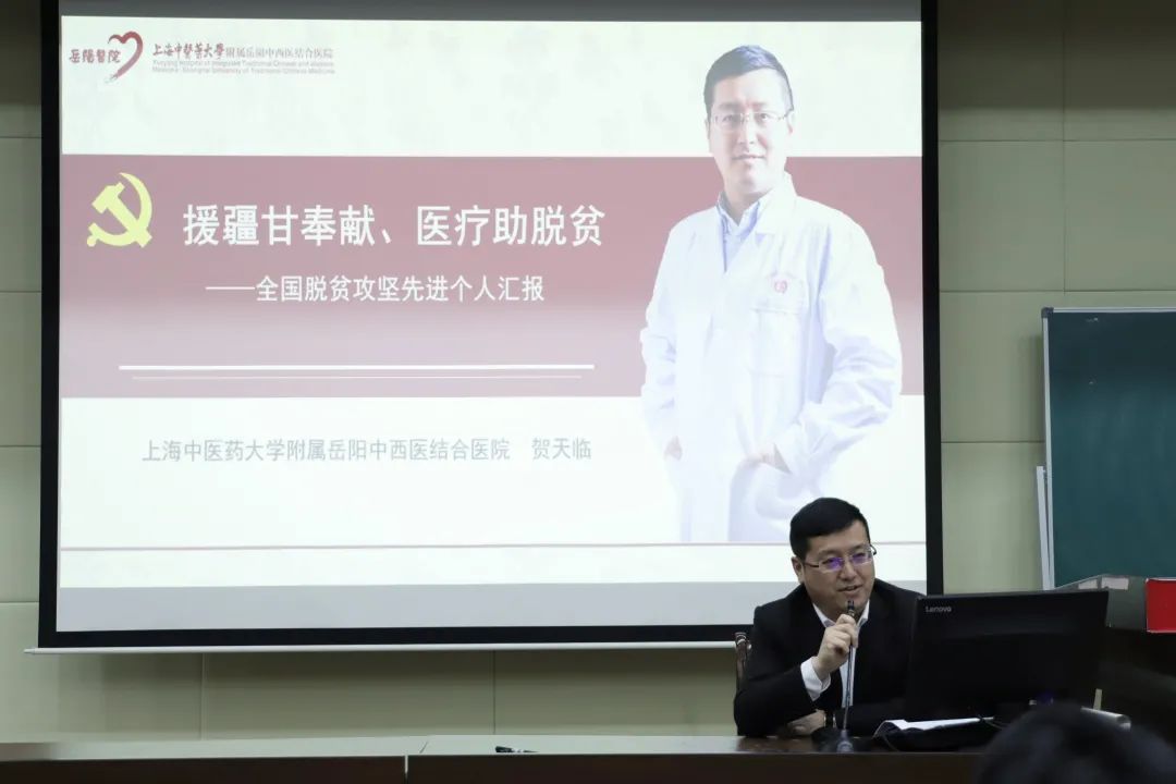 第二位分享者是“全国脱贫攻坚先进个人”贺天临老师,贺老师作为第八、第九批上海援疆干部人才两次援疆,以医疗助力脱贫攻坚。讲述中贺老师抢救心脏骤停的克拉玛依出租车司机,得知司机家境贫困,慷慨解囊,为患者家庭捐款;开设了上海援疆专家名医工作室,为克拉玛依市患者及北疆地区农村、牧区、兵团等地区的贫困群众接诊4000余人次;参加克拉玛依市医疗巡诊10次;克拉玛依市及北疆地区农村、牧区、兵团等贫困地区医疗义诊12次等事迹深深感染着同学们。淬炼初心,脱贫摘帽不是终点,而是新生活、新奋斗的起点,牢记初心使命,发扬脱贫攻坚精神。