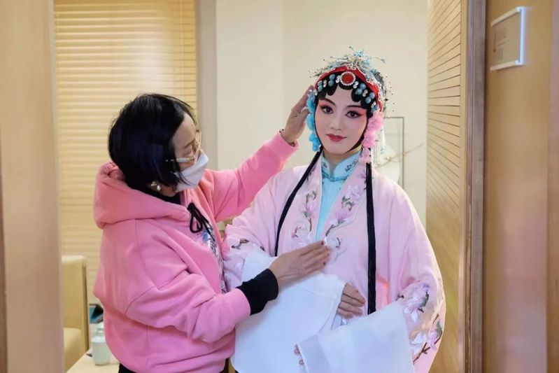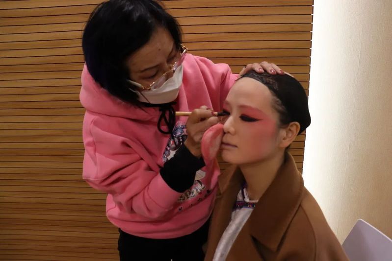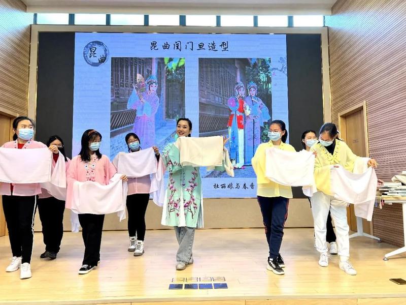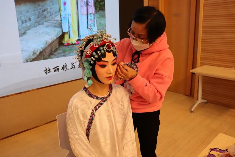 公司辅导员夏晴老师体验了昆曲的服装和化妆,扮成“杜丽娘”造型,同学们观赏了从准备阶段到最终成品的扮相过程。从上妆“拍彩-油彩-拍红-定妆-画眉眼-元宝嘴-勒头-贴片子-裹水纱-戴头面-耳鬓花”到身段,其过程之繁复也引发了同学们的惊叹。