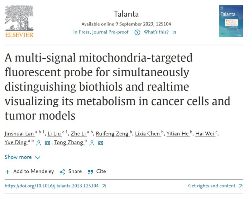 近日,公司张彤教授团队,在国际期刊Talanta上发表了题为“A multi-signal mitochondria-targeted fluorescent probe for simultaneously distinguishing biothiols and realtime visualizing its metabolism in cancer cells and tumor models”的研究成果(DOI: 10.1016/j.talanta.2023.125104)。该研究成功合成了一种具有多通道、线粒体靶向的荧光探针,能够同时区分检测生物硫醇和二氧化硫衍生物,实现了细胞水平及生物体内硫醇代谢的实时、可视化监测,并利用该探针对中药活性成分藤黄酸在体内外抗乳腺癌过程中的硫醇代谢变化进行监测。这一研究成果为体内硫醇代谢的动态监测提供了有力工具,同时也为中药抗肿瘤活性成分的作用机制研究提供新思路。