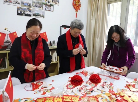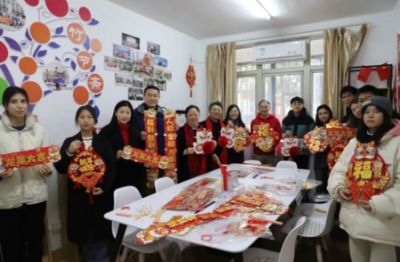 随后,学院领导班子与寒假留校员工在云苓楼思齐工作室制作窗花、灯笼和对联。岁寒情暖,在春节即将来临之际师生欢聚,共同制作充满传统文化要素的窗花、灯笼和对联,为寒假生活增添了浓浓的“年味”。最后,老师们为留校员工赠送精心准备的新春大礼包,寓意新年吉祥如意和最诚挚的新春祝福。
