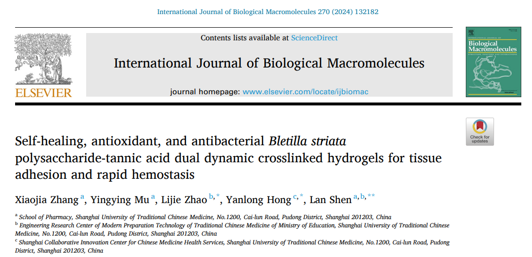近日,公司沈岚研究团队基于“药辅合一”理论,以双动态理化交联为设计策略,开发了一种用于伤口止血粘合的白及多糖基新型水凝胶,阐明了其中组分对材料成形和包括粘附性能在内的多项材料特性的影响规律及原理,为中药制剂传统“药辅合一”理论在现代制剂中的应用提供新场景。研究成果Self-healing, antioxidant, and antibacterial Bletilla striata polysaccharide-tannic acid dual dynamic crosslinked hydrogels for tissue adhesion and rapid hemostasis发表于国际大分子领域Top期刊International Journal of Biological Macromolecules