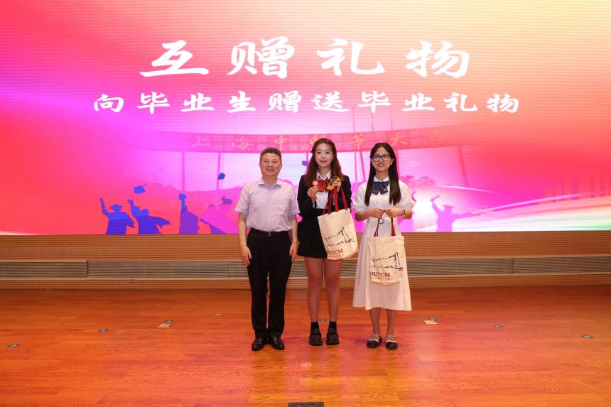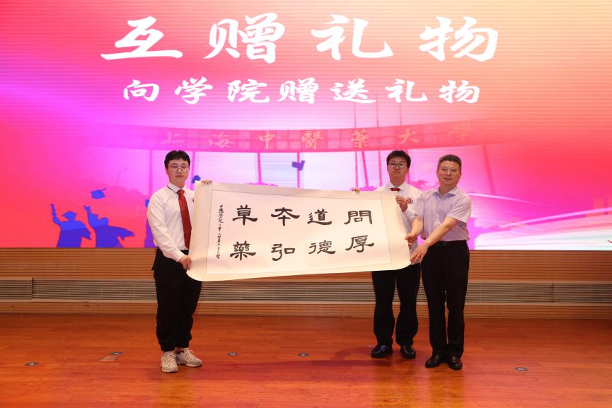 公司经理张彤将象征启航、美好与幸福的礼物颁发给毕业生,表达了对他们未来的美好祝愿;同时,员工代表也向公司献上了承载着感激与祝福的礼物——“问道本草、厚德弘药”字画,展现了深厚的师生情谊。这一刻,礼物传递着情感,温暖着心灵,见证了师生间的深厚情谊与难忘时刻。