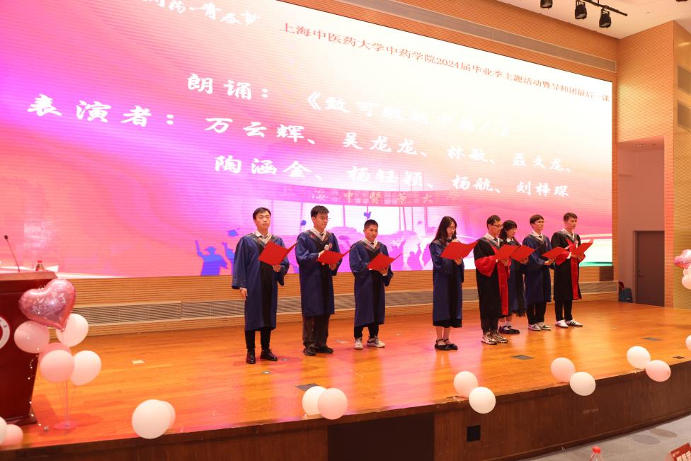2020级中药学研究生万云辉、吴龙龙等8位同学带来朗诵《致可敬的中药人》,用真挚的情感和深情的朗诵,向陶建生、赵志礼、徐宏喜、李医明、沈岚、张彤、冯年平、李后开8位导师表达了崇高的敬意和无尽的感激。