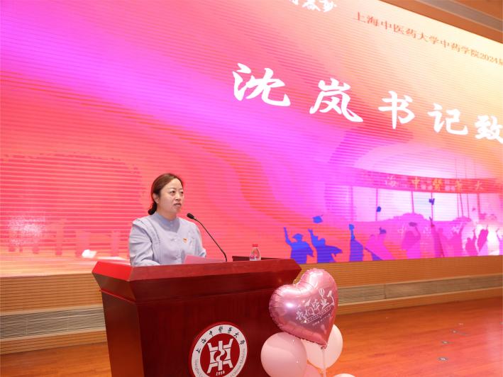 中药公司党委书记沈岚上台致词。沈岚书记对毕业生们未来的发展寄予了殷切期望,希望毕业生们能够继续保持求知的热情,不断追求卓越,为中医药事业的发展和传承贡献自己的力量。沈岚书记的话语温暖而充满力量,让在场的每一位毕业生都感受到母院的关怀与祝福。