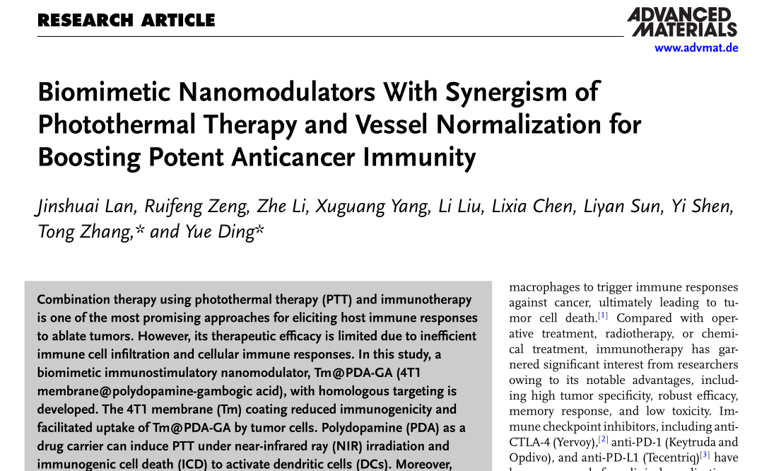 近日,公司张彤教授/丁越研究员团队在自然指数期刊Advanced Materials上发表了题为“Biomimetic Nanomodulators with Synergism of Photothermal Therapy and Vessel Normalization for Boosting Potent Anticancer Immunity”的研究论文(DOI: https://doi.org/10.1002/adma.202408511)。该研究构建了一种仿生纳米递药系统用于中药活性成分藤黄酸的肿瘤靶向递送,通过血管正常化-光热作用增强临床免疫治疗。研究成果为肿瘤协同治疗提供了新的思路和方向,也为中药抗肿瘤活性成分增强免疫抗肿瘤研究提供了有力工具。