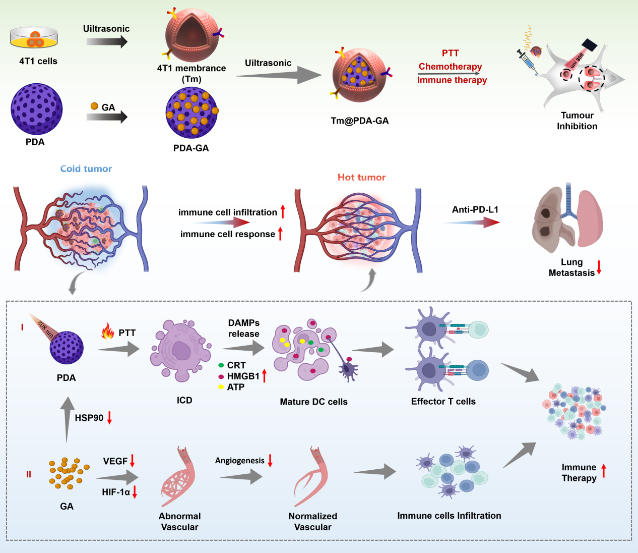 该仿生纳米系统具有以下优点:(1)肿瘤细胞膜包覆能够增强制剂Tm@PDA-GA NPs的免疫逃逸能力以及肿瘤靶向性。制剂中的GA介导的血管正常化能力以及PDA介导的PTT能够进一步增强制剂在肿瘤部位的渗透。(2)制剂Tm@PDA-GA NPs能够在肿瘤酸性环境下响应性释放GA,不仅能够抑制热休克蛋白,增强PTT-化疗协同作用,还能够进一步增强PTT引起的免疫原性死亡,增强树突状细胞DCs熟化。另外,GA通过下调HIF-1αVEGF表达,介导肿瘤血管正常化,能够增强肿瘤免疫浸润并改善肿瘤乏氧微环境。(3DCs的熟化能够激活效应T细胞,通过进一步联用anti PD-L1能够有效抑制乳腺癌生长及肺转移