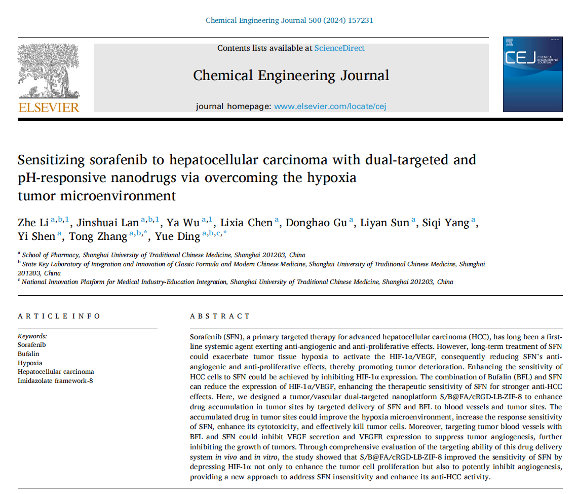 近日,公司张彤教授/丁越研究员团队在国际知名期刊Chemical Engineering Journal上发表了题为“Sensitizing sorafenib to hepatocellular carcinoma with dual-targeted and pH-responsive nanodrugs via overcoming the hypoxia tumor microenvironment”的研究论文(DOI:https://doi.org/10.1016/j.cej.2024.157231)。该研究构建了一种肿瘤-血管双靶向纳米递药系统用于中药蟾酥中活性成分蟾毒灵(Bufalin,BFL)和肝癌治疗一线药物索拉非尼(Sorafenib,SFN)的靶向递送,通过改善肿瘤乏氧微环境和调控血管生长抑制肿瘤细胞增殖,诱导肿瘤细胞凋亡,增强SFN与BFL的协同抗肝癌作用。研究成果将中药与现代高效递药系统相结合,为改善索拉非尼长期用药引起的肝癌治疗敏感性降低提供新策略。