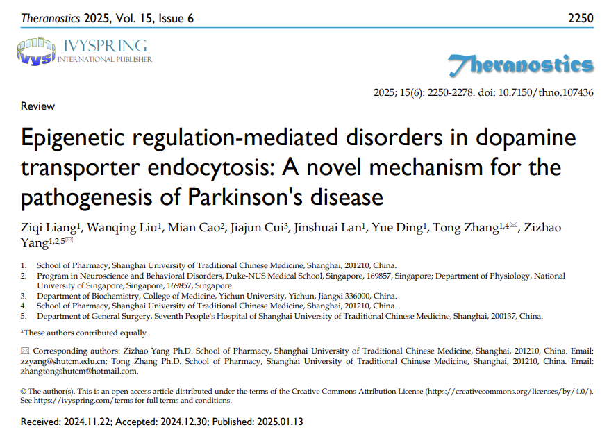 近日,公司张彤教授/杨子钊研究员团队在国际知名期刊《Theranostics》(影响因子:12.4,中科院一区)上发表了题为“Epigenetic regulation-mediated disorders in dopamine transporter endocytosis: A novel mechanism for the pathogenesis of Parkinson's disease”(DOI:https://www.thno.org/v15p2250.pdf )的综述文章。系统性地探讨了DNA甲基化、RNA修饰、组蛋白信号更替及非编码RNA调控等表观遗传机制对多巴胺转运体(Dopamine Transporter, DAT)内吞作用的影响,揭示了这些表观遗传调控方式通过激活DAT内吞作用来影响多巴胺能神经元的存活和功能,进而诱发帕金森病(Parkinson's disease, PD)产生及发展的新机制。本综述为PD的发病机制提供了全新的视角和理论框架,不仅为早期临床诊断指明了潜在方向,还为后期治疗揭示了潜在药物靶点,并为其分子病理机制的研究奠定了坚实的科学基础。