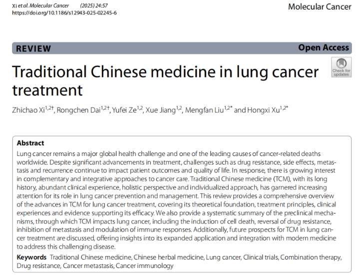 公司首席教授徐宏喜团队在Molecular Cancer发表中医药治疗肺癌研究进展综述