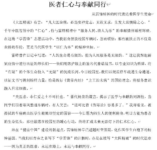2023级中药学研究生团支部于2月开展“双轨并进学雷锋”主题活动。团支部以征文为载体深植奉献精神,共征集作品35篇,《医者仁心与奉献同行》一文将雷锋精神与医者使命相融,文中引用雷锋日记,结合《大医精诚》、《黄帝内经》,诠释“大医精诚”与志愿情怀的共鸣;通过规范停车、张贴标语等行动呼应征文内核,实现“以文载道”深化认知、“以行践履”强化担当的知行合一。支部以活动为契机,推动志愿服务机制化,让雷锋精神的火炬在杏林学子的笔端与行动中永续传递。