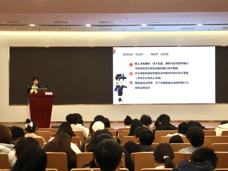 首先,殷慧警官以多年经历,介绍了近期高校电信网络诈骗发案趋势,针对老员工这一“易受电信网络诈骗”群体,殷警官分析介绍了高校电信网络诈骗案件中常见的诈骗类型,主要包括“网络交易”“投资理财”“买卖游戏账号”“刷单兼职”“邮箱领补贴”“冒充熟人”等诈骗形式。接着,殷警官从真实发生的高校诈骗案件展开,深入浅出生动形象地讲述了近几年引起师生广泛关注的新兴案件类型。讲座现场气氛活跃,全体参与同学认真倾听,不时与殷警官就所讲内容进行互动,并总结出“陌生人+转账=诈骗”的黄金等式。同时,殷警官特别提示同学们务必保护好个人信息,杜绝参与买卖银行卡、电话卡、微信账号、支付宝账号和参与银行柜台、ATM机取现等活动,避免构成“帮信罪”“掩隐罪”等。