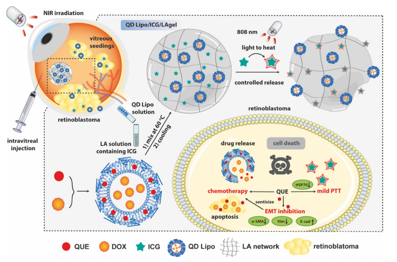 近日,公司冯年平/吕雅琪团队在生物医学1区期刊《Theranostics》(IF: 12.4)发表题为Hybrid NIR-responsive liposome/hydrogel platform mediating chemo-photothermal therapy of retinoblastoma enhanced by quercetin as an adjuvant的研究论文。该研究报道了一种基于共载槲皮素/多柔比星脂质体(QD Lipo)的吲哚菁绿-低熔点琼脂糖水凝胶(QD Lipo/ICG/LAgel)。QD Lipo/ICG/LAgel是一种具有光热响应能力的可注射水凝胶药物递送系统,通过玻璃体注射将QD Lipo/ICG/LAgel植入玻璃体腔,利用近红外光的照射远程控制负载脂质体与光敏剂的释放,通过玻璃体腔内的局部可控化疗-光热治疗联合提升视网膜母细胞瘤的疗效,为视网膜母细胞瘤的治疗提供新的模式。