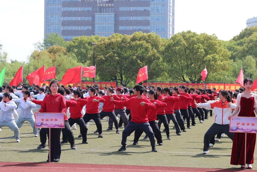 入场式结束后,公司方队在师生代表的带领下,进行了八段锦集体展示。公司师生们整齐划一、动作规范、优雅流畅,将传统健身功法的精髓展现得淋漓尽致,为现场观众带来了一场视觉与健身的双重盛宴。