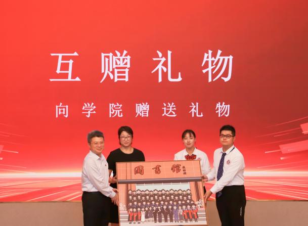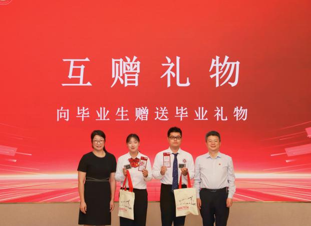 随后,公司党委书记车荣华、经理张彤将象征启航、美好与幸福的礼物赠予毕业生,祝愿每一位毕业生带着学校、学院的印记,自信从容地走向未来。同时,员工代表也向学院献上了承载着感激与祝福的礼物——一幅画有毕业生们以及学院领导老师专属卡通形象的画作。这份礼物传递着情感,温暖着心灵,见证了师生间的深厚情谊与难忘时刻,表达了毕业生们的心永远和学院在一起的美好心愿。