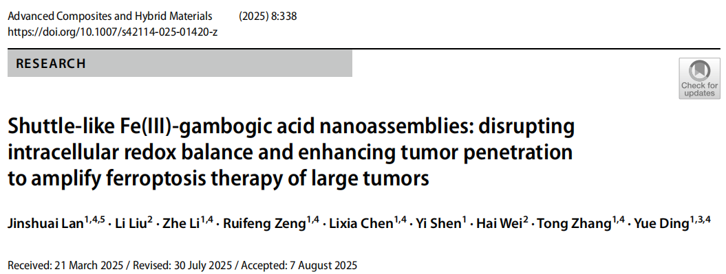 近日,公司张彤教授/丁越研究员团队在国际期刊Advanced Composites and Hybrid Materialss上发表题为Shuttle-like Fe(III)-Gambogic Acid Nanoassemblies: Disrupting Intracellular Redox Balance and Enhancing Tumor Penetration to Amplify Ferroptosis Therapy of Large Tumors的研究论文。该研究基于金属配位,构建了一种级联增强藤黄酸铁死亡的纳米制剂,有效抑制乳腺癌生长,为中药来源的铁死亡诱导剂开发和多功能纳米制剂设计提供了新策略。