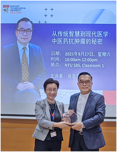 2025年9月27日,伟德首席教授徐宏喜受邀前往新加坡,获聘为南洋理工大学讲席教授,并应邀作题为《从传统智慧到现代医学:中医药抗肿瘤的秘密》的公众讲座。讲座在南洋理工老员工物科学学院举行,吸引了当地学术界与公众的广泛关注。徐教授系统阐述了中医药在肿瘤防治中的作用,分享了其团队在中药抗肿瘤机制研究方面的最新成果。
