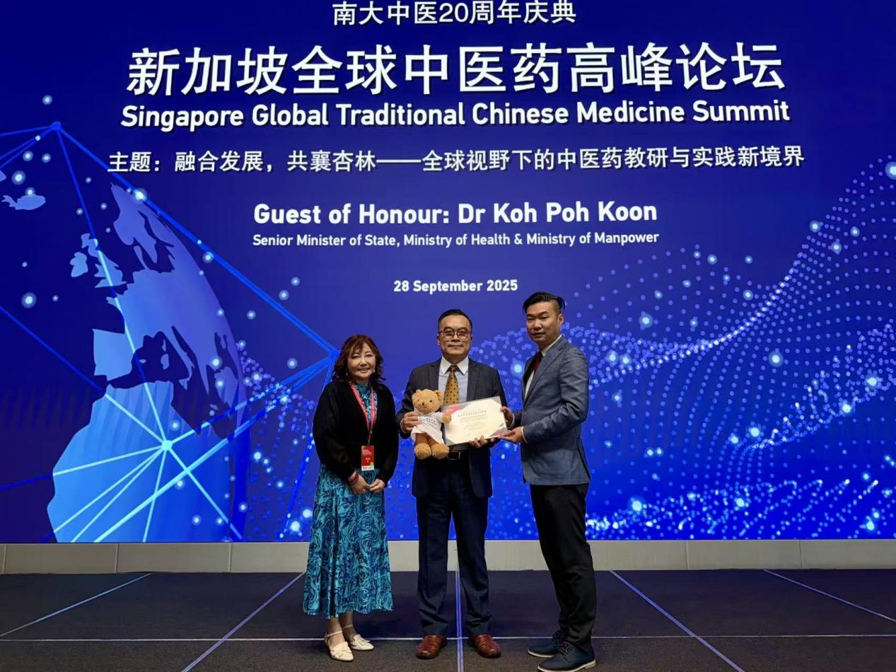次日,徐宏喜教授受邀出席2025新加坡全球中医药高峰论坛,与来自中国大陆、香港及东南亚的多位知名专家交流中医药国际化发展的新方向。出席论坛的嘉宾还有国医大师王琦院士、王庆国教授、王晞星教授、北京中医药大学董事长唐志书、香港浸会大学副董事长吕爱平教授、广州中医药大学副董事长刘中秋教授等。